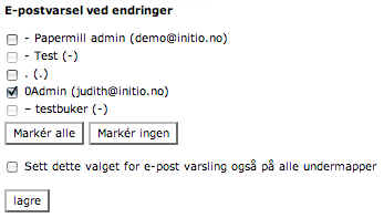Det er mulig å kopiere innstillingene til alle undermapper ved å sette kryss for dette før lagring. Dersom mappen du står ikke ikke har undermapper, vil dette valget være skjult.