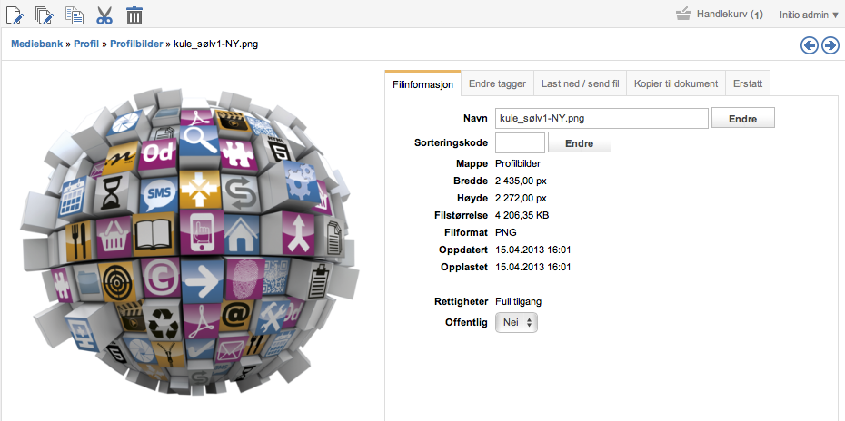 I mediebanken kan du laste opp hvilke filtyper som helst. Men merk at bilder som lastes opp til bruk på maler og dokumenter bør være pdf, png eller jpeg.