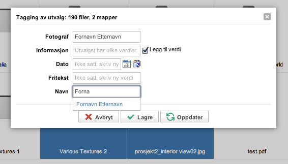 2. Dersom en tagg har ulikt innhold på de markerte objektene, vil det du fyller ut her bli lagt til i tillegg til det som måtte finnes på objektene fra før. Dersom du tar bort krysset for «legg til», vil det du skriver inn tømme eksisterende innhold i taggen på alle objektene, og erstatte med det du fyller ut.