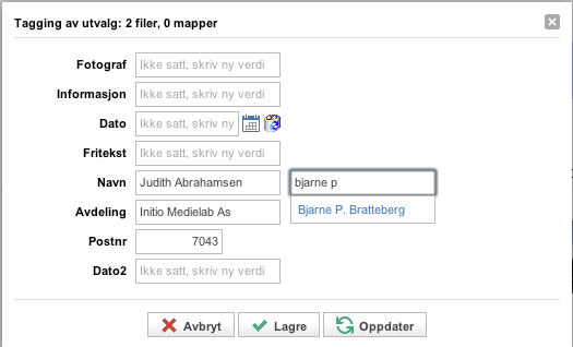 Dersom taggen er av type «autofullfør» vil du kunne legge til ett og ett navn fra listen over brukeren i Corda, og klikke «oppdater» for å legge til dette navnet. Navnene legges til atskilt med komma. Dersom en eller flere andre tagger er satt opp med nøyaktig samme tagnavn som en variabel på firmaet, vil Corda søke i variabeldataene på det valgte navnet og fylle ut alle taggene med variabeldata som er lagret på brukeren. Når du har klikket «oppdater» vil det aktiveres et nytt felt til høyre for feltene med autofullfør-funksjon hvor du kan legge til et nytt navn. Dette navnet legges til det forrige atskilt med komma. Når et nytt navn legges til blir på samme måte variabeldata lagt til på den eller de andre taggene med tagnavn=variabelnavn.