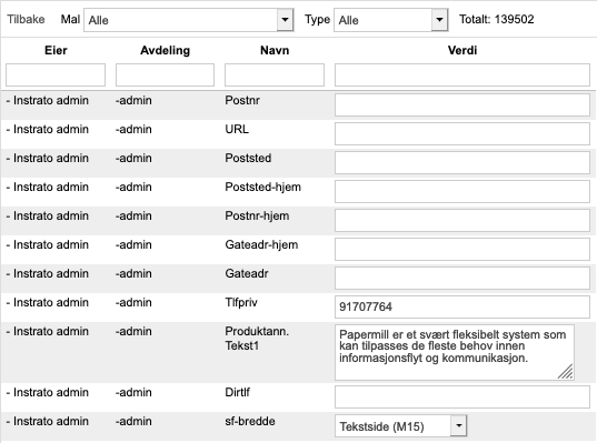 I listen får du se hvem som eier variabelen, navnet på variabelen, og et felt å skrive variabelteksten i. Dersom admin har satt en variabel til å være tekstboks, vil feltet være større, og du kan også legge inn linjeskift. Der variabelen er satt til å være droppliste, kan du velge riktig alternativ i droppliste her.