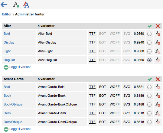 - Fontfiler – Følgende filer kan lastes opp: otf/ttf (påkrevd), eot, woff og svg. De fleste nettlesere støtter nå otf, men for en del eldre nettlesere må man laste opp eot/woff/svg for at tekstredigering skal støttes med fonter som ikke er installert på brukerens egen PC. For de fleste fonter kan Fontsquirrel konvertere en font fra otf/ttf til de andre fontfilene.